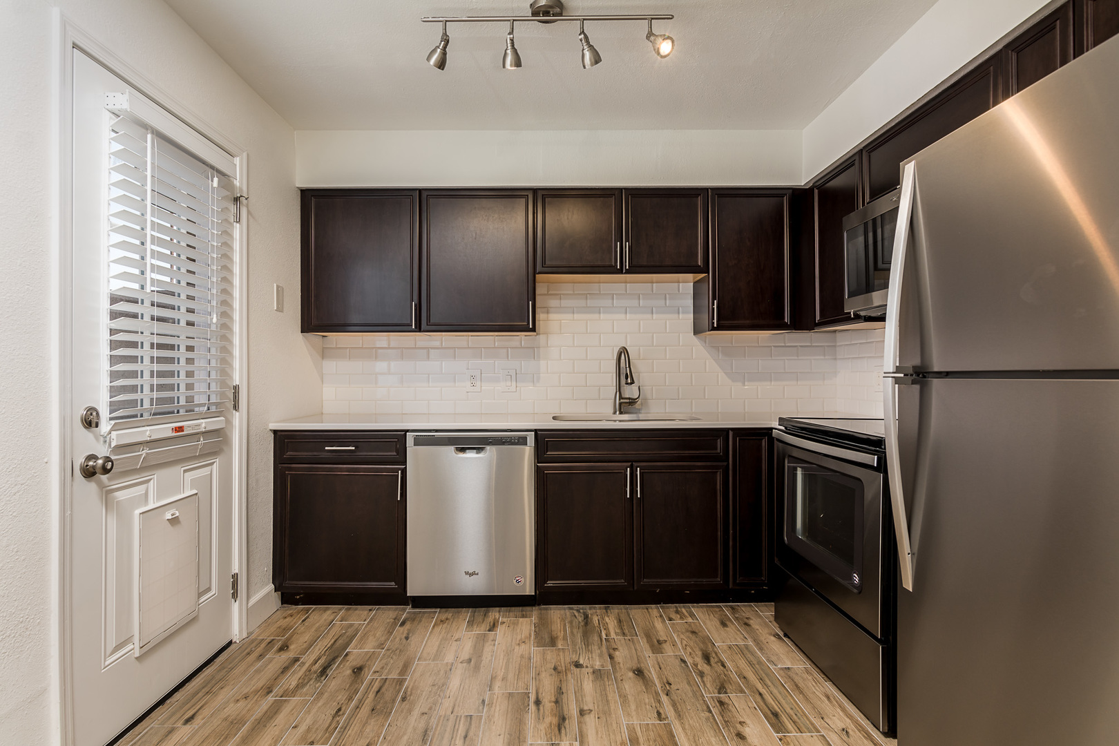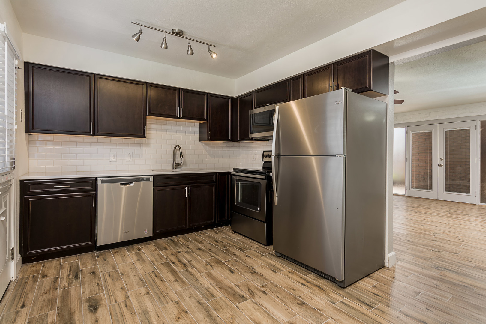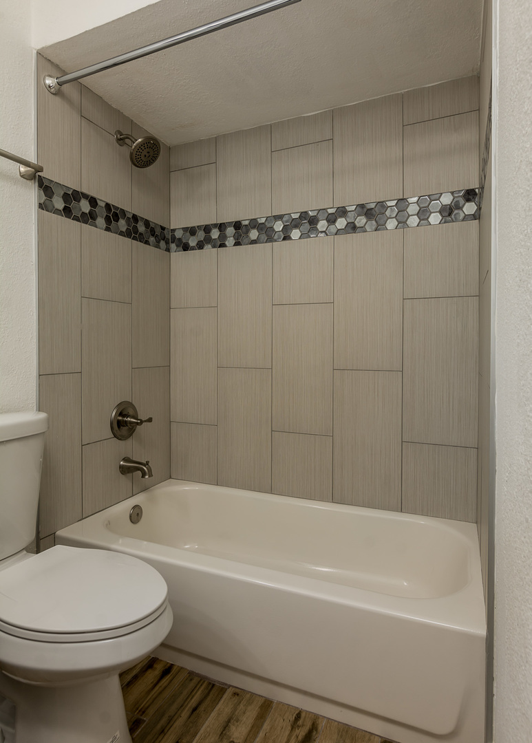 Nicely remodeled 3 bed, 2 bath condo with a huge fenced backyard in Arcadia. Entire unit has been completely updated - new porcelain tile floors throughout, new solid wood kitchen cabinets, quartz counters, under-mount sink, stainless steel appliances and beveled subway tile back splash in kitchen. Updated baths with tiled showers, new cabinets and fixtures. Master bath has walk-in shower, dual sinks and a linen closet. Dual pane windows, 2" wood blinds, 6-panel interior doors, new ceiling fans and accent walls in every room. This condo has a huge private, grass backyard. 1 assigned covered parking space. A large storage unit comes with condo as well. The building is a 4-plex on a large lot with lots of green space. Pool recently remodeled with pebble-tech finish